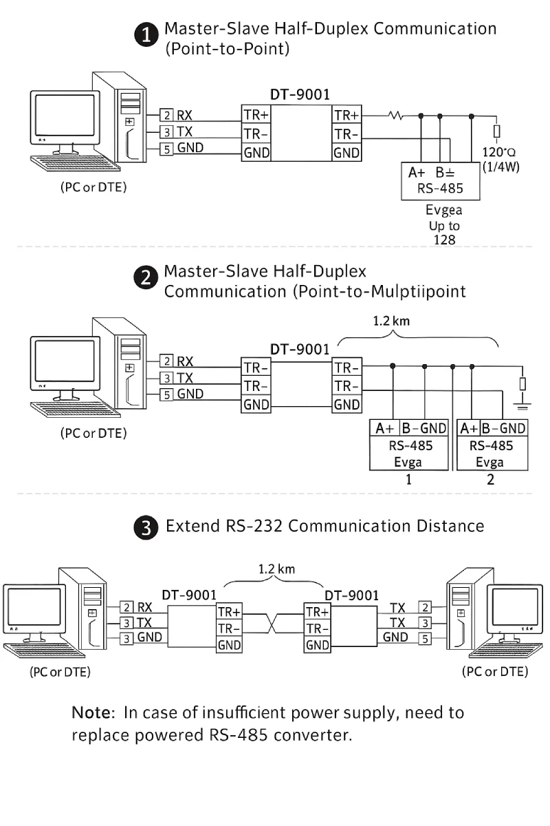 Sử dụng hai thiết bị DT-9001 để truyền tín hiệu RS232 từ máy tính này sang máy tính khác với khoảng cách lớn tới 1.2km, bằng cách chuyển RS232 → RS485 → RS232.