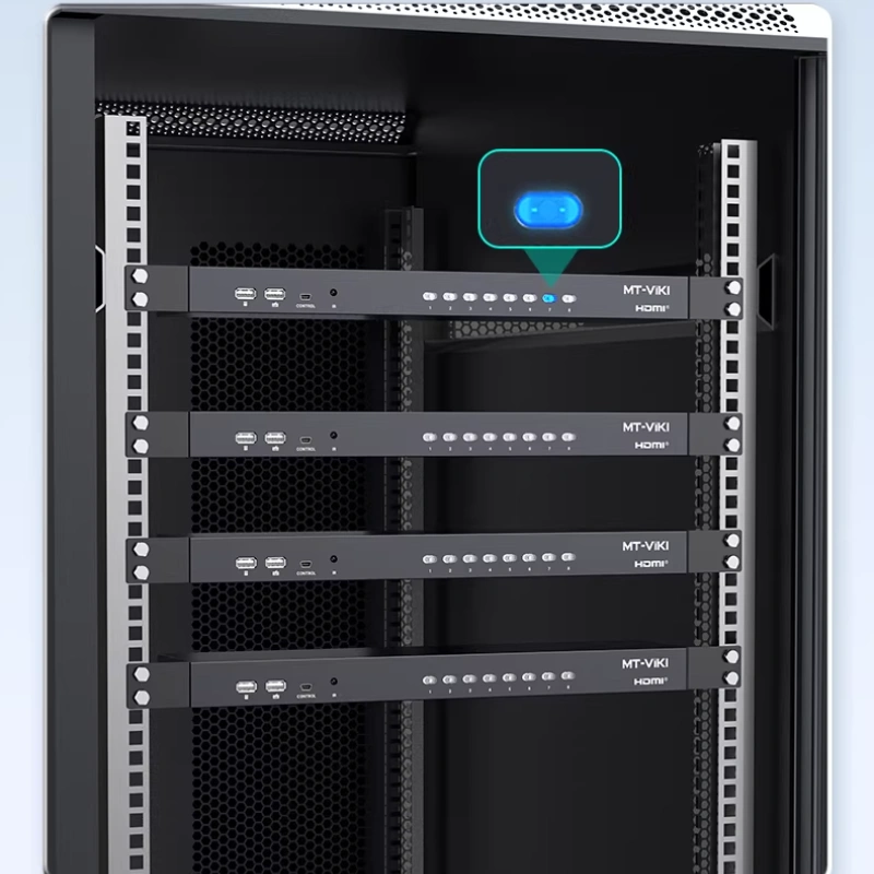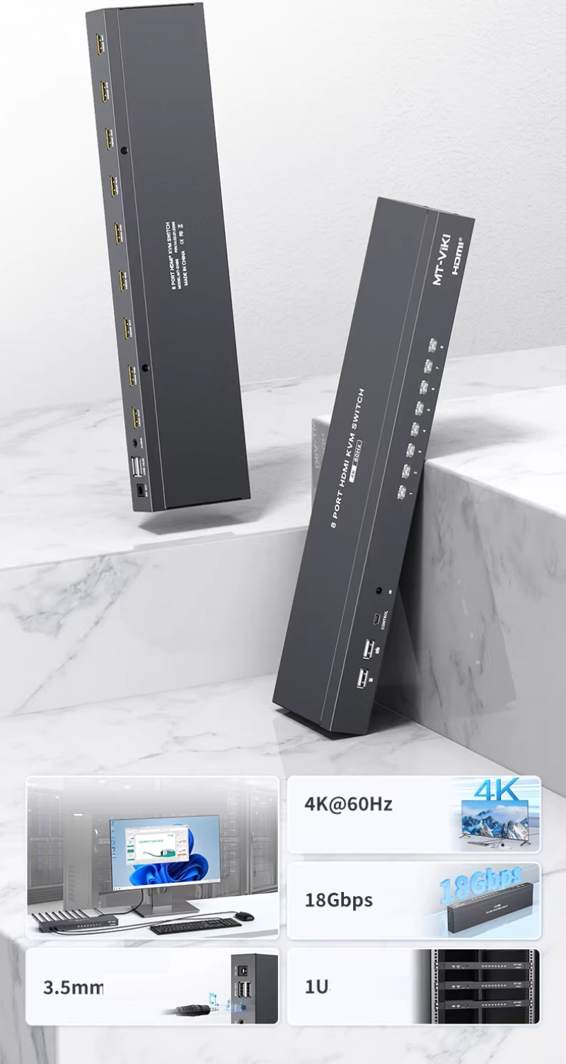 MT-KH8S còn được gọi là KVM Switch HDMI 8 cổng, KVM HDMI 8 vào 1 ra, hay bộ chia HDMI KVM 8 port, là giải pháp tối ưu giúp tiết kiệm không gian, giảm thiết bị ngoại vi và tăng hiệu suất quản lý hệ thống.