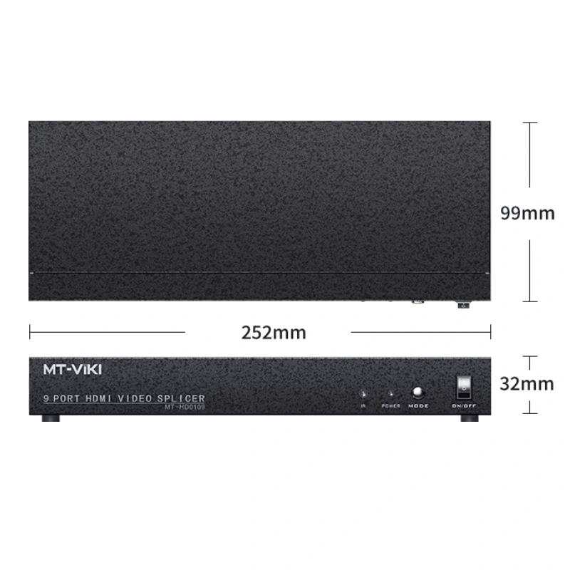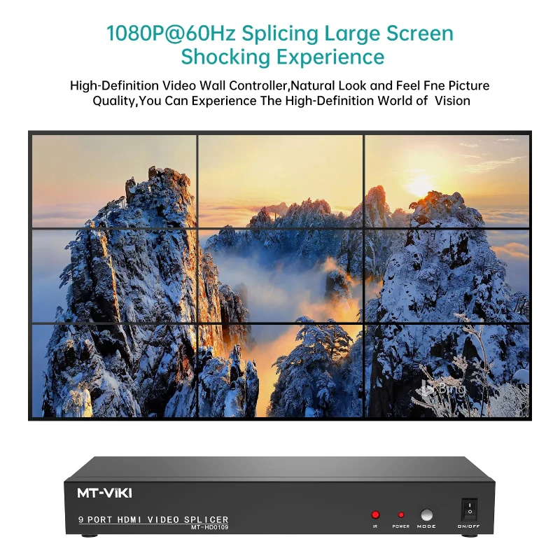 MT-VIKI MT-HD0109 là bộ điều khiển ghép màn hình HDMI chuyên dùng cho hệ thống video wall 3×3, cho phép chia một nguồn tín hiệu HDMI thành 9 màn hình hiển thị đồng thời. Thiết bị hỗ trợ độ phân giải lên đến 1080P 60Hz, hoạt động ổn định, cấu hình đơn giản, phù hợp cho showroom, trung tâm điều khiển, quảng cáo, hội trường, sân khấu và hệ thống giám sát.