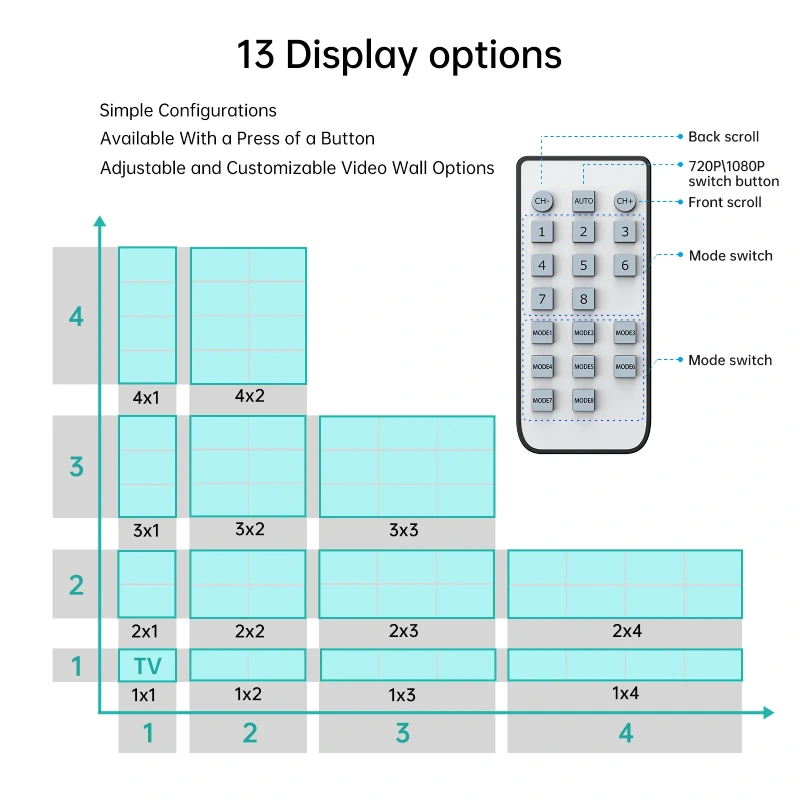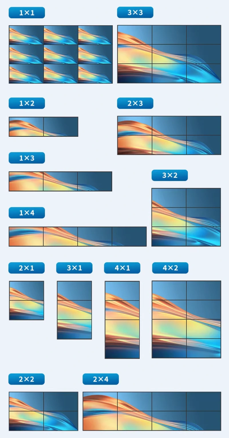 Bộ điều khiển ghép màn hình HDMI / HDMI Video Wall MT-VIKI MT-HD0109 hỗ trợ 13 chế độ hiển thị linh hoạt, đáp ứng hầu hết nhu cầu ghép tường màn hình quảng cáo và trình chiếu chuyên nghiệp: