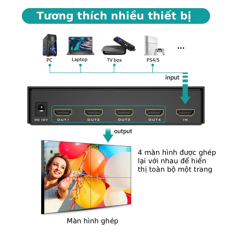 - ✔ Chia tín hiệu HDMI 1 ra 4 đồng thời, không trễ hình