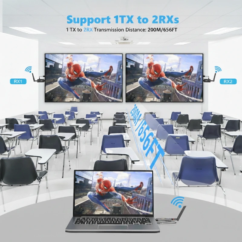 Bộ thu phát HDMI không dây 200m 1080P WL084 cho phép kết nổi 1 bộ phát với 2 bộ nhật để hiển thị nội dung đồng thời trên 2 màn hình khác nhau