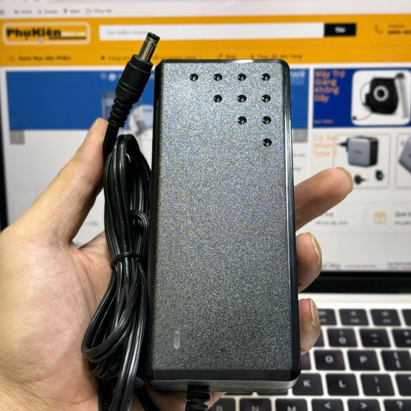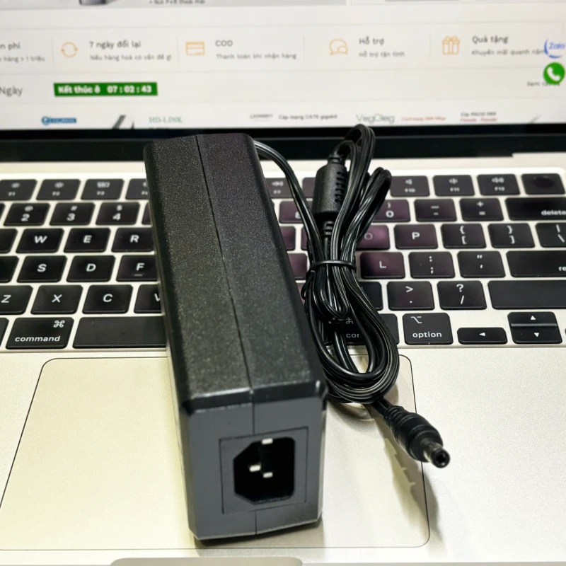 Sản phẩm được trang bị dây DC dài 1.2m có lõi chống nhiễu ferrite core cùng đầu cắm DC 5.5×2.5mm (tương thích 5.5×2.1mm) và input AC chuẩn IEC C13, dễ dàng thay/cắm dây nguồn tiêu chuẩn.