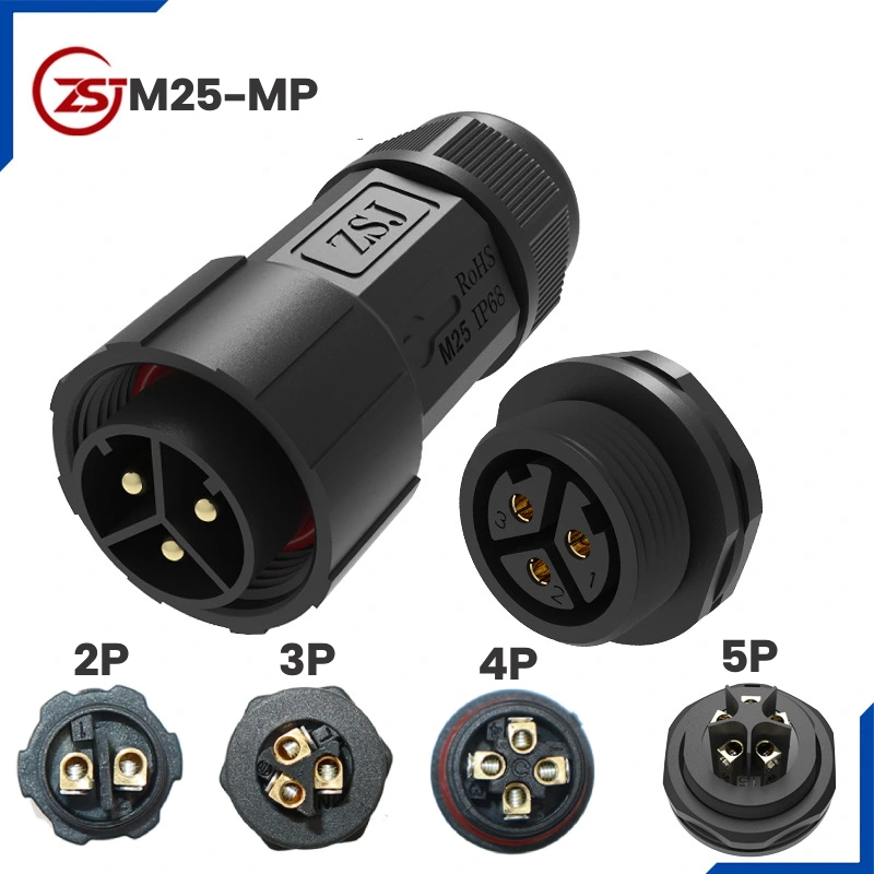 Phích nối điện chống nước IP68 ZSJ-M25-MP loại chân bắt vít (2–5 chân) lắp bảng điều khiển, vỏ nhựa PA chịu nhiệt, chân đồng mạ niken. Kết nối an toàn, bền bỉ cho hệ thống điện công nghiệp, chiếu sáng ngoài trời, năng lượng mặt trời và môi trường ẩm ướt.